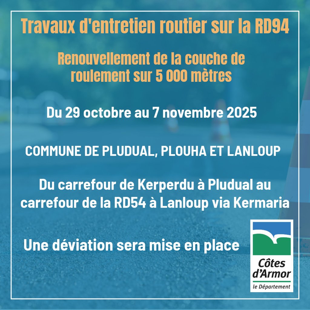 Le Conseil départemental s’apprête à effectuer des travaux d’entretien routier du renouvellement de la couche de roulement sur la route départementale N°94, sur les communes de Pludual, Plouha et Lanloup.