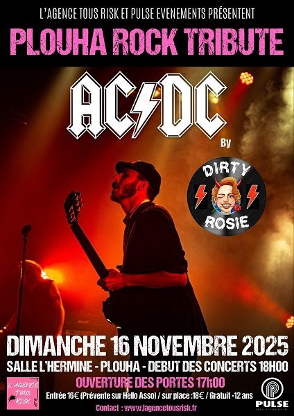 Organisé par L'Agence Tous Risk et Pulse Événements, spectacle de Dirty Rosie. A la salle Hermine, ouverture des portes à 17h et début du concert à 18h. Entrée adulte 16€ en prévente, 18€ sur place et gratuit moins de 12 ans.