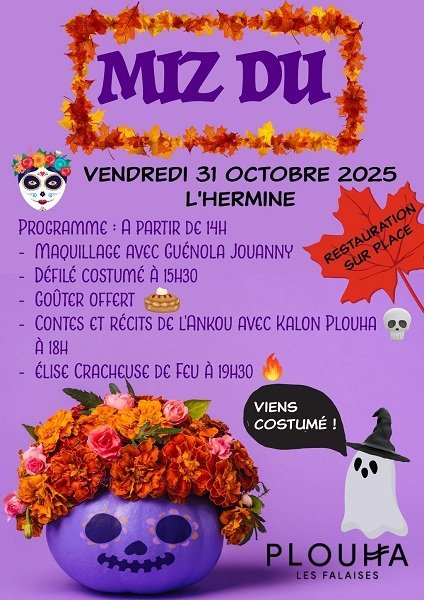 Organisé par la municipalité, à partir de 14h, atelier maquillage, défilé costumé à 15h30, goûter offert, contes et récits de l'Ankou à 18h et spectacle de Elise, cracheuse de feu à 19h30.