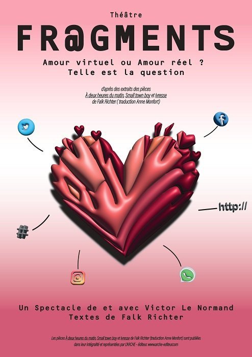 Fragments est un spectacle dans lequel un jeune homme va traverser plusieurs sentiments, plusieurs états d’âmes tout en se posant des questions sur des relations amoureuses, qui, pour lui, n’aboutissent pas vraiment si on reste figé entre nos quatre murs derrière notre ordinateur à surfer sur les réseaux sociaux.