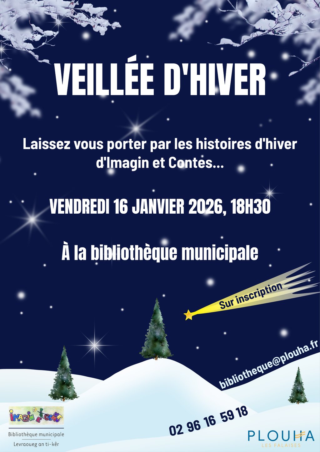 Le vendredi 16 janvier 2026 à 18h30, rendez-vous à la bibliothèque municipale pour une veillée d'hiver avec Imagin et Contes.
