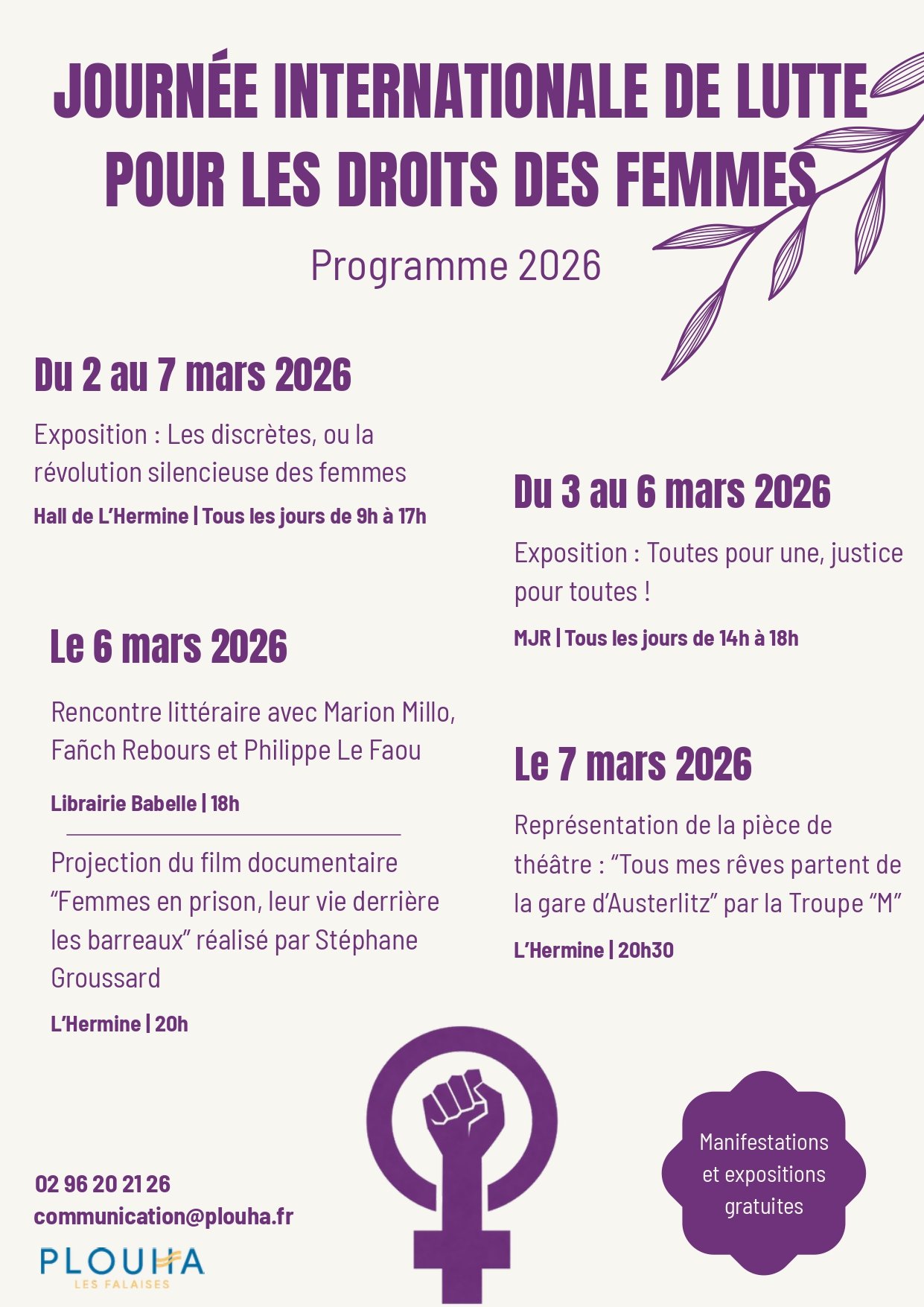 À l'occasion de la Journée internationale de lutte pour les droits des femmes du 8 mars, la municipalité vous propose une série de manifestations et d'expositions.