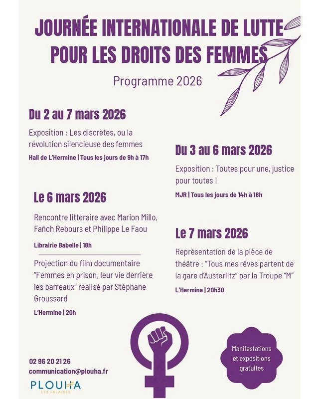 À l'occasion de la Journée internationale de lutte pour les droits des femmes du 8 mars, la municipalité de Plouha vous propose une série de manifestations et d'expositions.