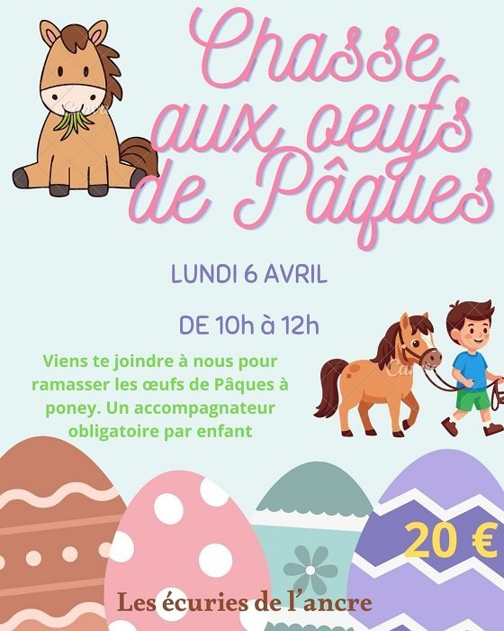 Les écuries de l'ancre organise une chasse aux œufs de Pâques à Poney! Un accompagnateur obligatoire par enfant. 20€.